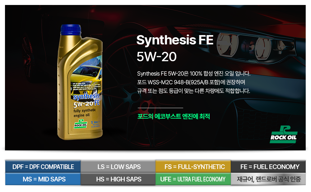 락오일 Synthesis FE 5W-20은 100% 합성 엔진 오일 입니다. 포드 WSS-M2C 948-B(925A/B 포함)에 권장하며 규격 또는 점도 등급이 맞는 다른 차량에도 적합합니다.