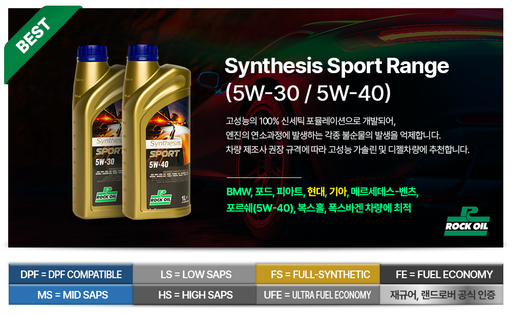 락오일 Synthesis Sport 제품군은 100% 합성 엔진 오일로 규격 또는 점도가 맞는 모든 휘발유, 디젤 차량에 적합합니다.